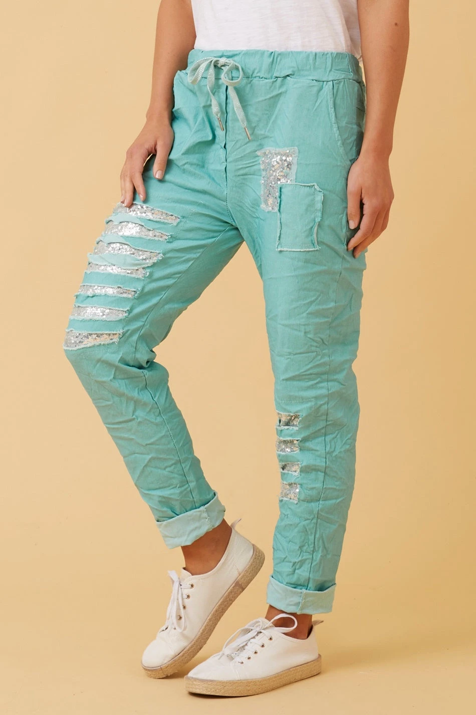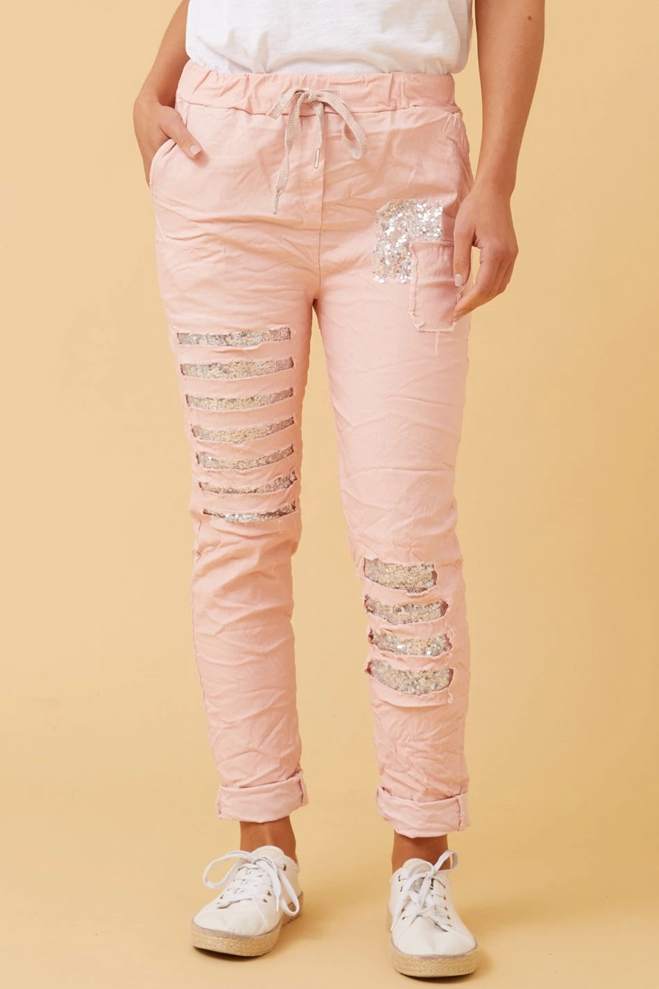 Introducing the famous Aida joggers. Features a comfortable elastic waist with drawstring, side pockets with sequin trim embellishment. The perfect pant to make a statement in your everyday comfortable joggers! An easy pant to style with tank tops or tshirts and your favourite runners!