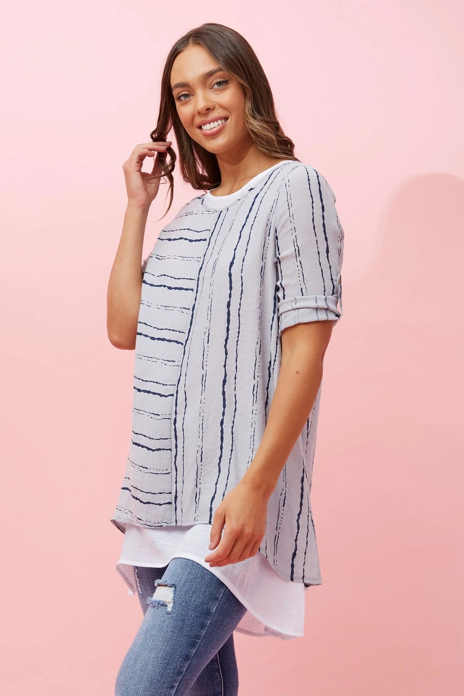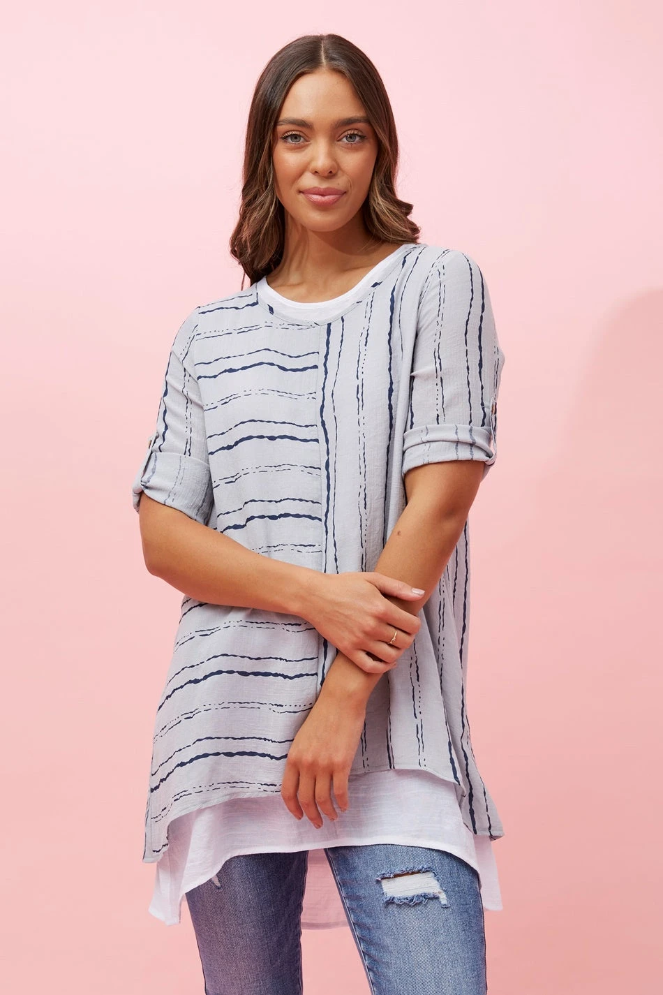 Featuring a minimalistic abstract print and double layered detail, our Aisha top is perfect for your day-out and city explorations. Easy to roll up sleeves with the button detail for a more casual look! Pair it with your favourite jeans and white runners for a comfortable and stylish summer look!