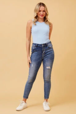 These jeans feature ripped front detail, and is a comfy fit that enhance your feminine curves. Features two functional back pockets and an elasticated waistband. Slim in fit, team with your favourite summer top and flats for an off duty weekend look.