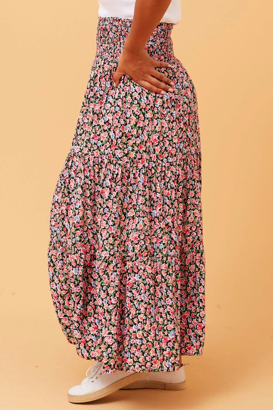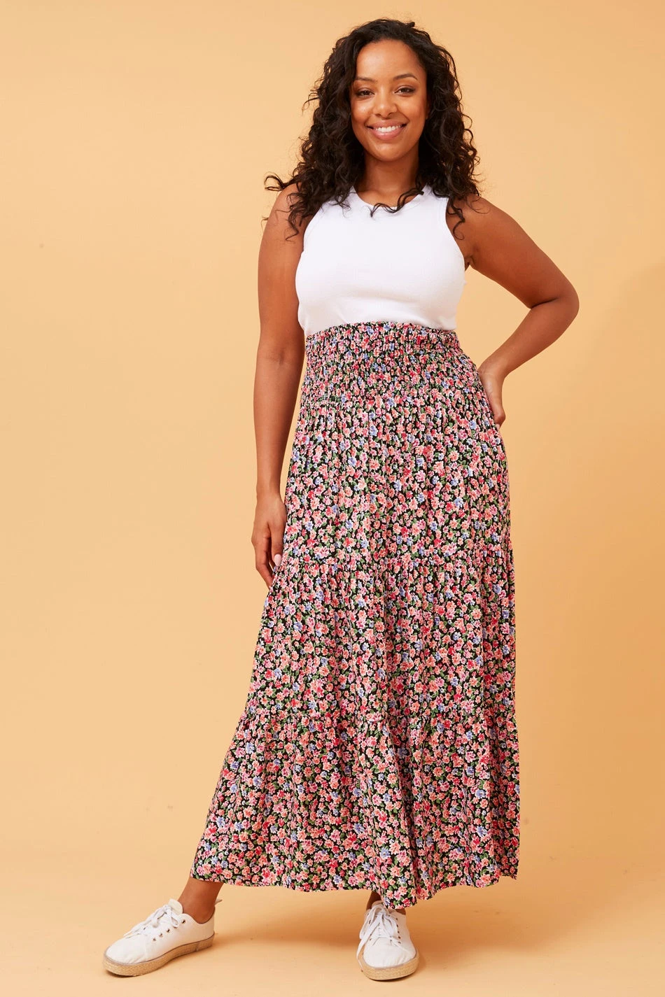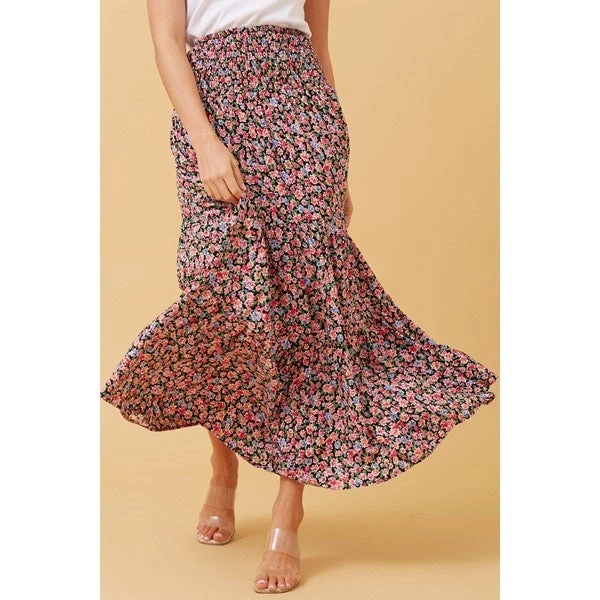 Our floral boho tiered skirt is a gorgeous addition to any wardrobe. Style with a blouse and heels for an elegant and stylish office look or style with a statement graphic tee and heeled boots for an elevated chic look!