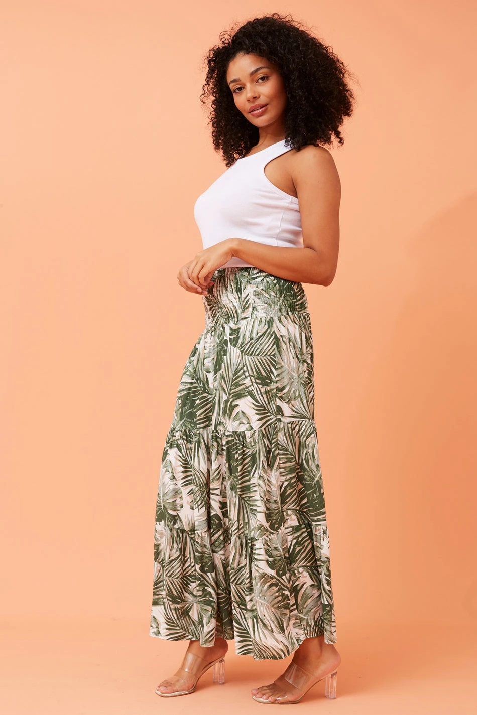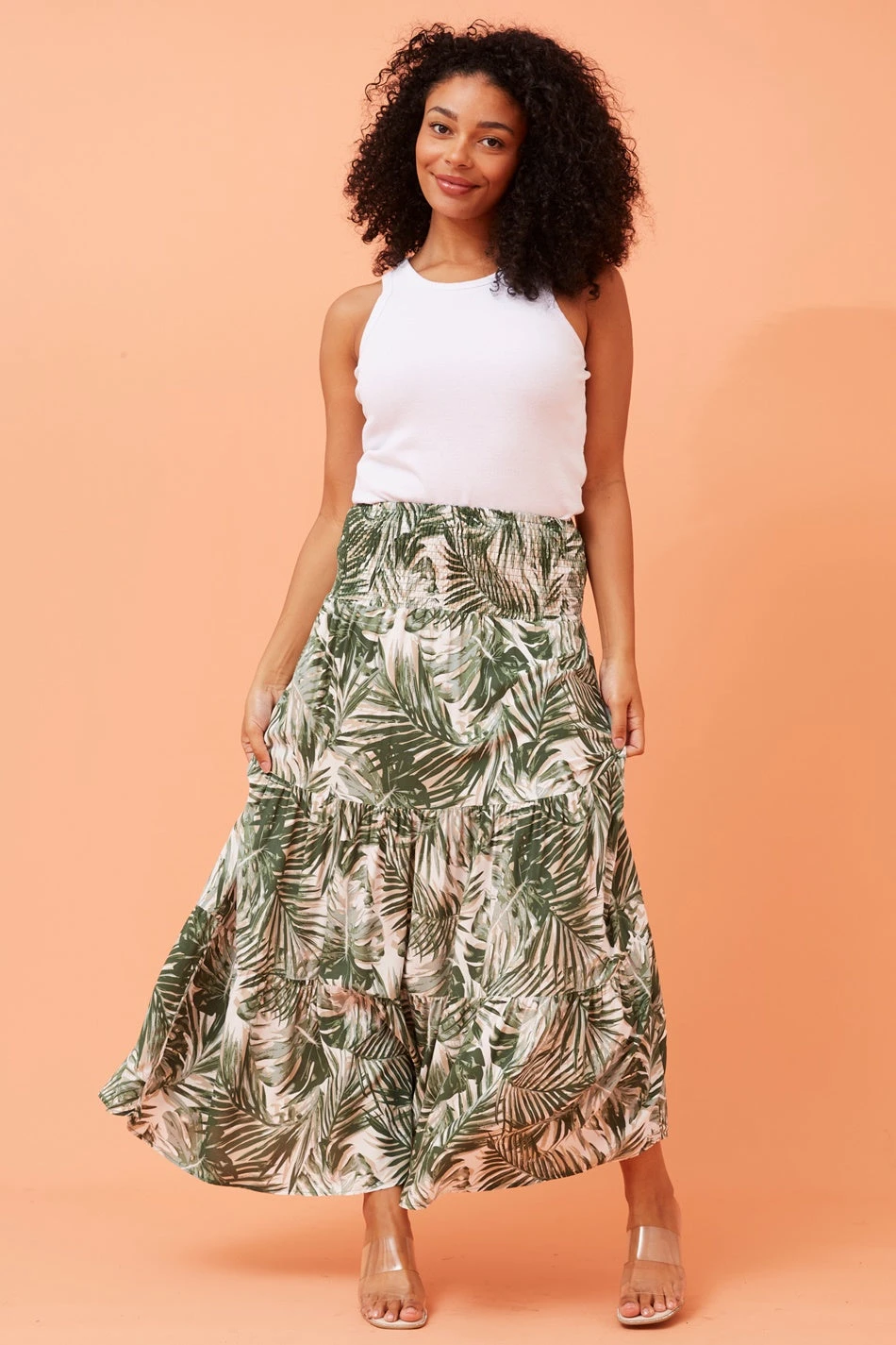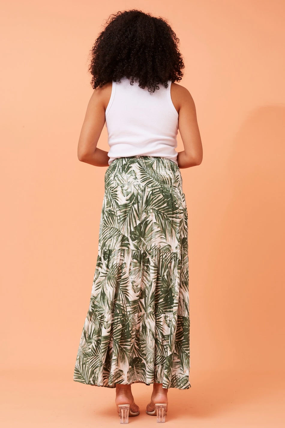 Our Bettina leaf print tiered skirt is a gorgeous addition to any wardrobe. Style with a blouse and heels for an elegant and stylish office look or style with a statement graphic tee and heeled boots for an elevated chic look!