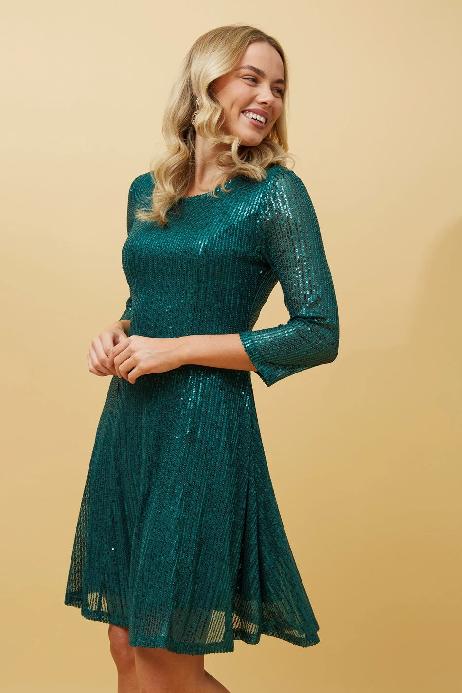 Our Camila sequin dress is a fabulous take on the sophisticated cocktail dress. It has a fitted lined bodice and a scoop round neckline creating an edgy touch. Team up with your favourite heels for a glam weekend outing vibe.