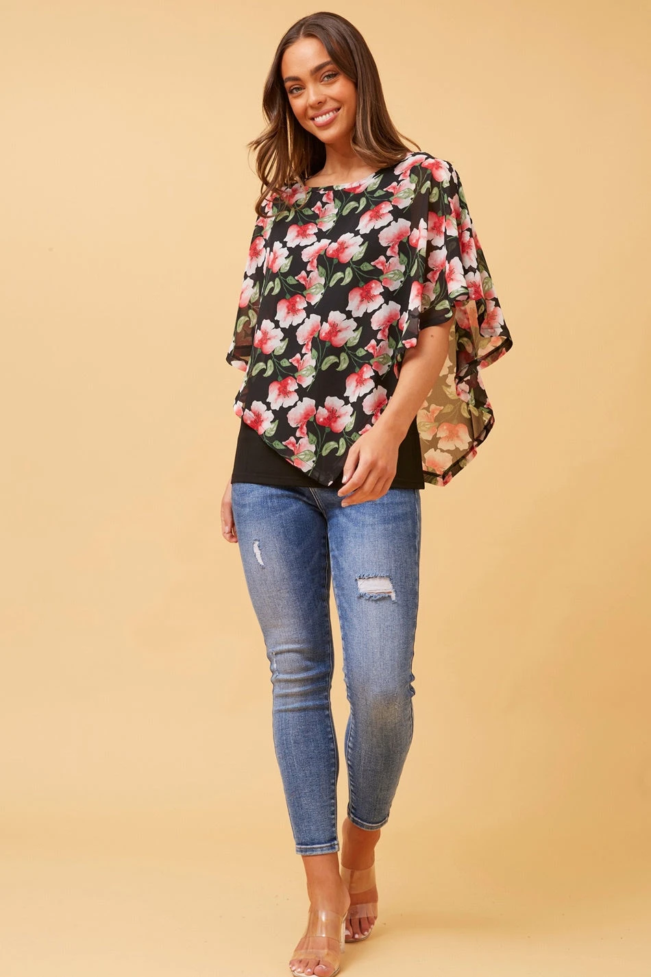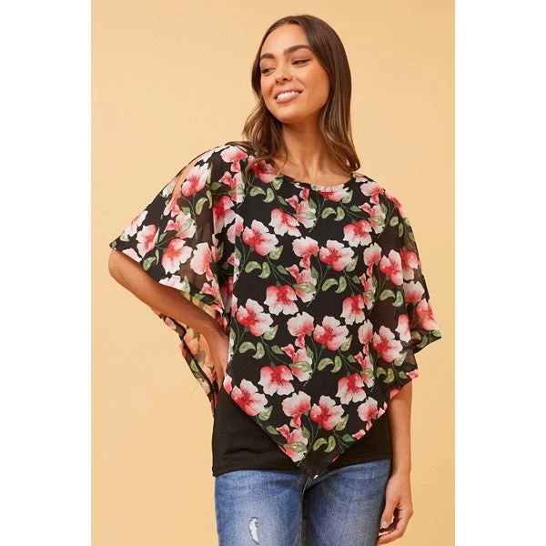 Achieve an elegant look with this butterfly sleeve top. Sheer black fabric with beautiful floral print featuring asymmetric hem and slit sleeves give you chic elegant look. Pair it with your favourite slim pants and strappy heels to finish the look.