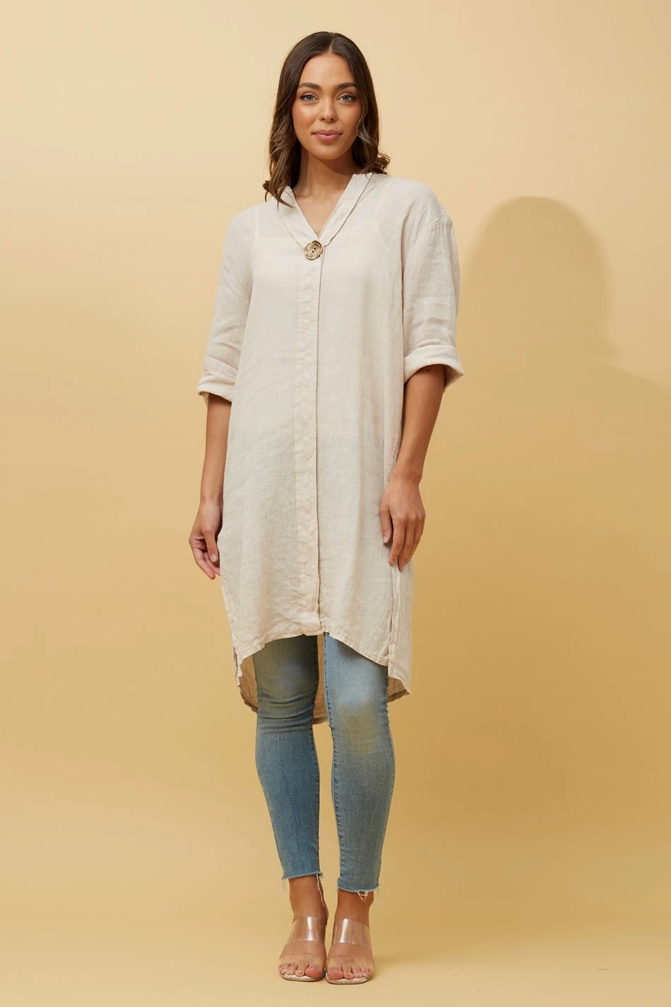 This Made in Italy stunner features a V collar and an optional roll up sleeves. Perfect for your casual day time look, easy to pair this top with your everyday jeans and runners for a casual day look or style with linen bottoms for that Byron Bay vibe!