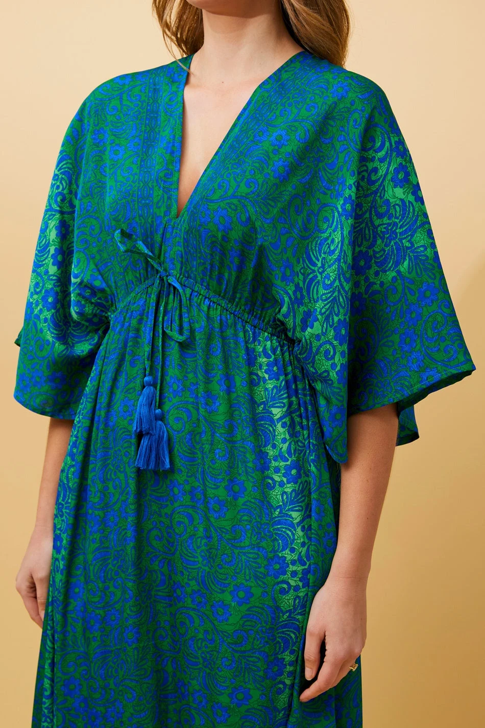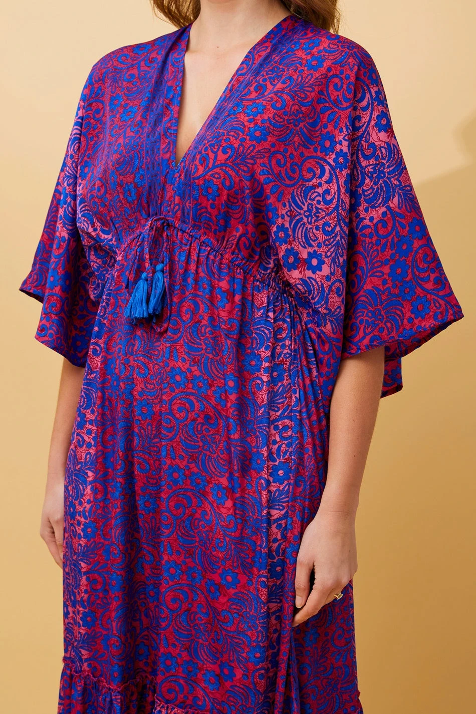 The Chandra dress has a lightweight look as it descends to maxi length, where the cinched in waist with ties work to add further appeal. Beautifully made in India, the dress offers a relaxed design with 3/4 sleeves and dramatic V shaping front and back creating an effortless allure.