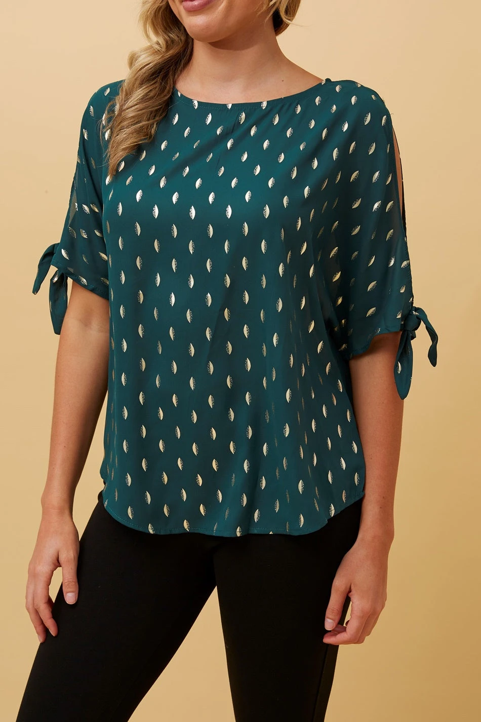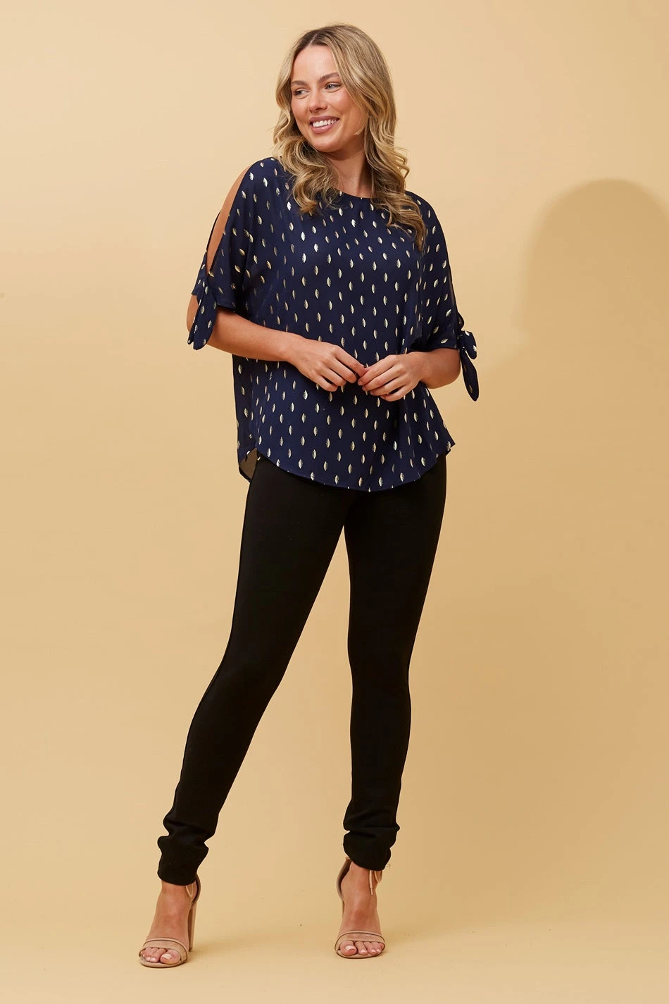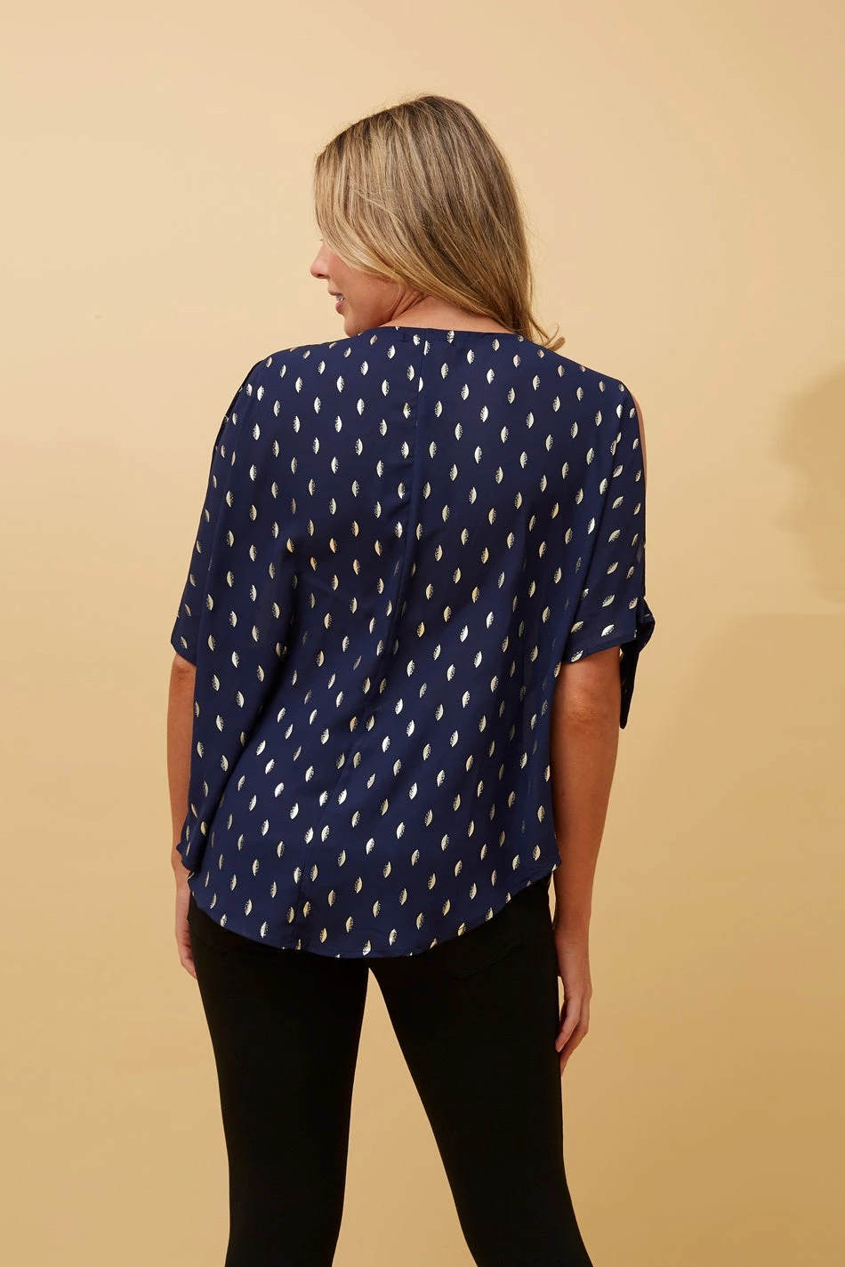 Feel absolutely beautiful in this cold shoulder foil print top. Style with skinny jeans and sandals or kicks for an effortless and stylish look!