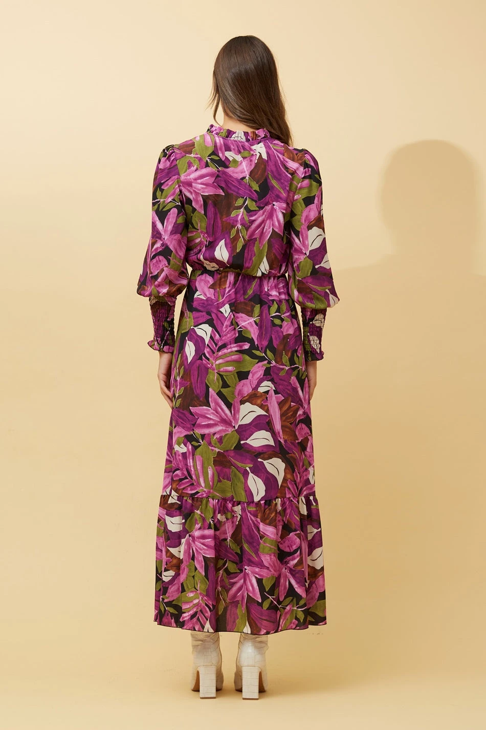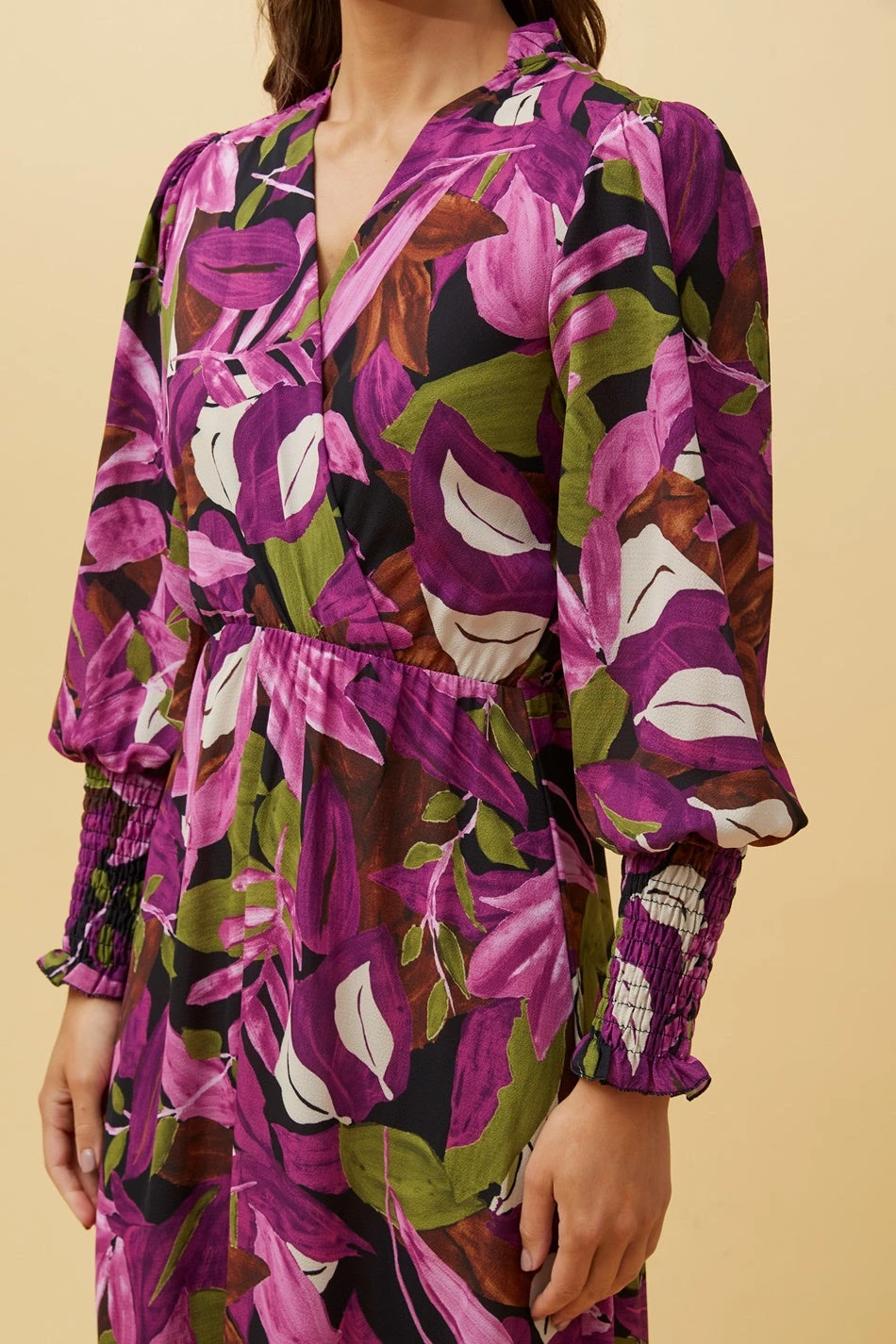 - Long balloon sleeves with shirred cuffs