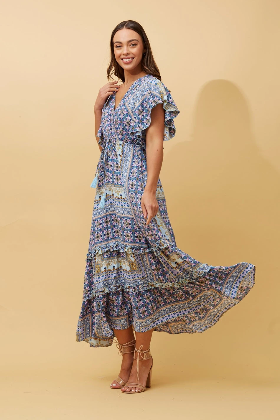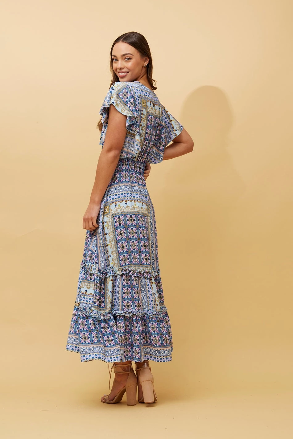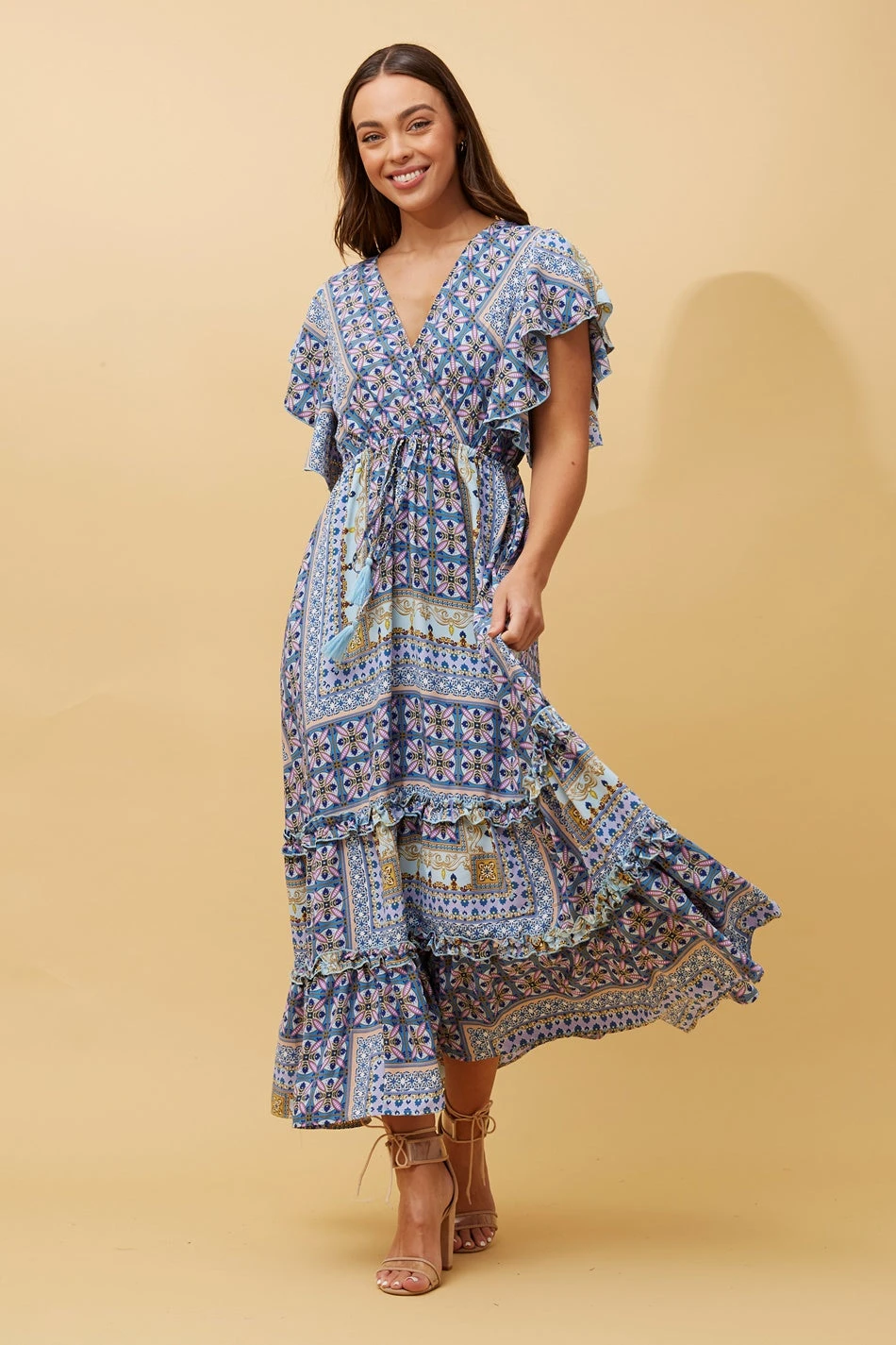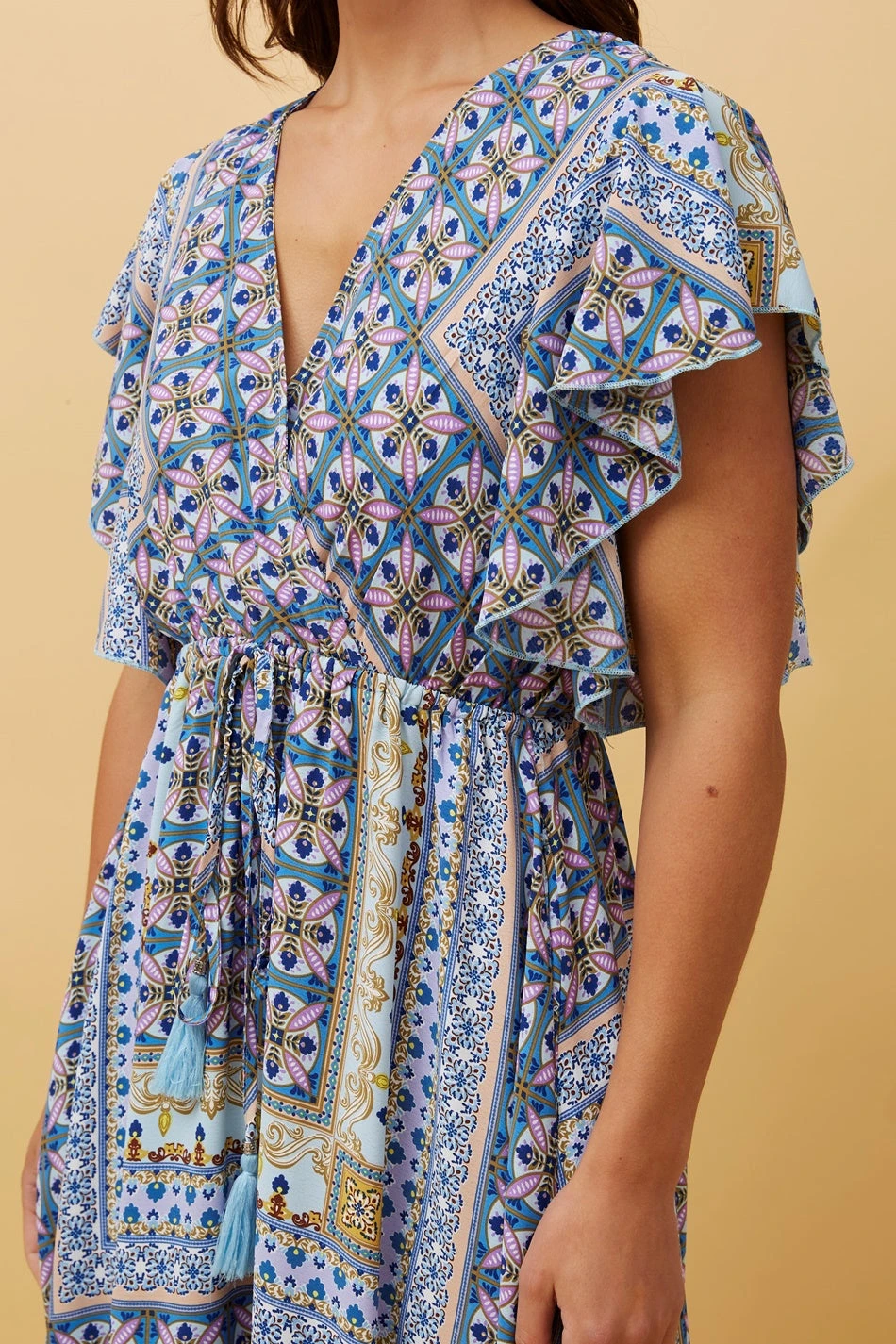This effortlessly stylish dress features a captivating patchwork print that blends eclectic patterns seamlessly. The short frill sleeves add a touch of playful charm, while the crossover front adds a hint of allure.