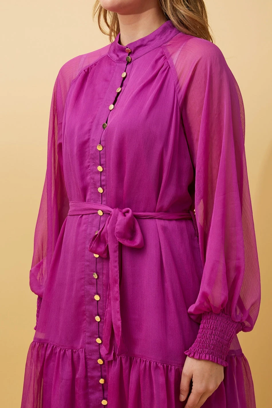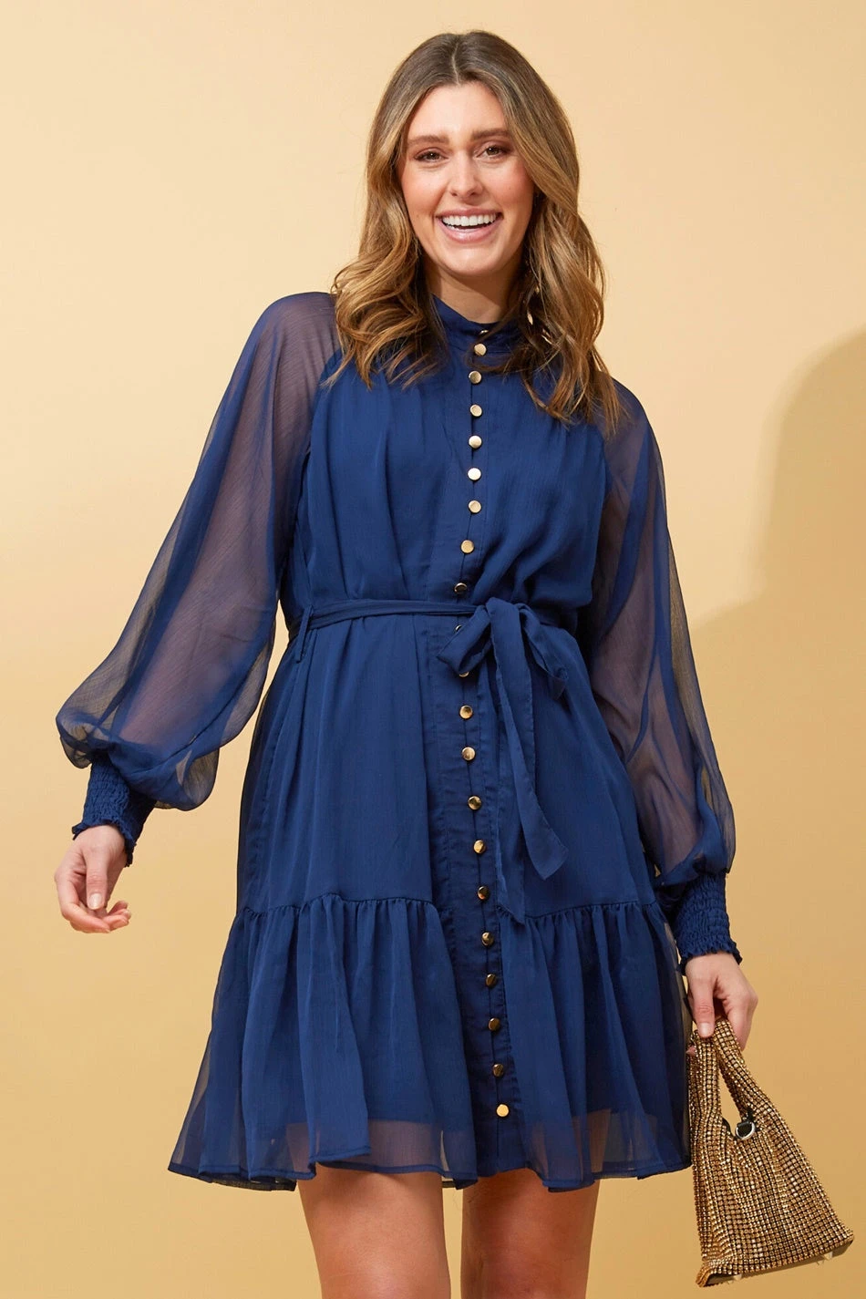 Our Illaria button front short dress is the perfect dress to wear to stand out from the crowd. Make it a night to remember in this chiffon dress featuring a semi-sheer design, high neck, button front, long balloon sleeves, a flounce hem, and A-line silhouette. Wear it to a party with heels and statement jewellery to complement!