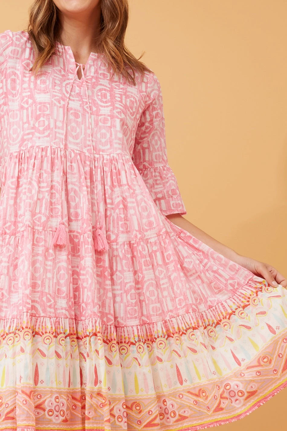 - Shallow V neckline with self fabric tie and tassel detail