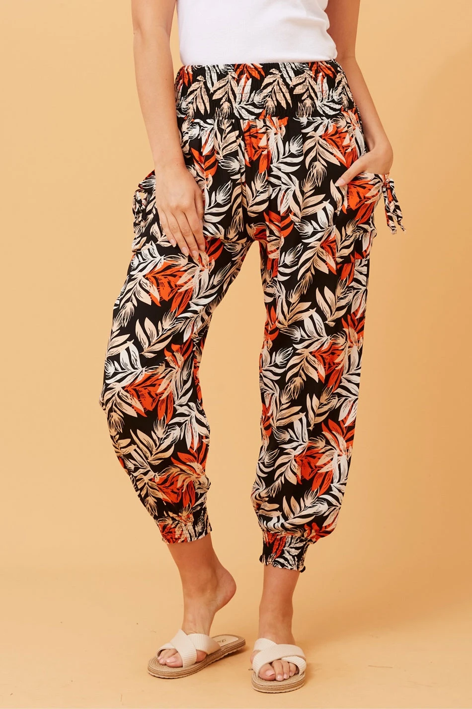 These pants feature a captivating leaf print that evokes the spirit of tropical paradise. The harem silhouette ensures a comfortable and relaxed fit, perfect for casual outings or lounging in style. The self-tie side pockets add both functionality and a fashionable twist, allowing you to customize your look.