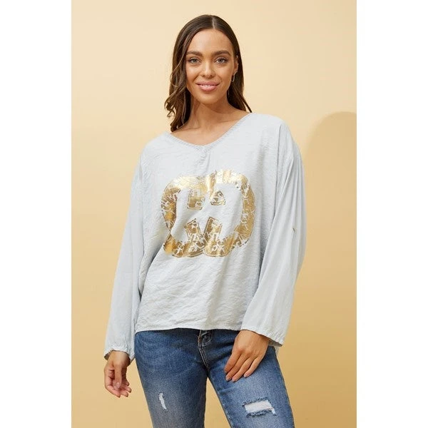 Featuring a shallow V neckline, foil graphic print and long roll-up sleeves, this Made in Italy is ideal for all casual day outs! Pair this with ripped jeans and sneakers for a comfy autumn/winter outfit!
