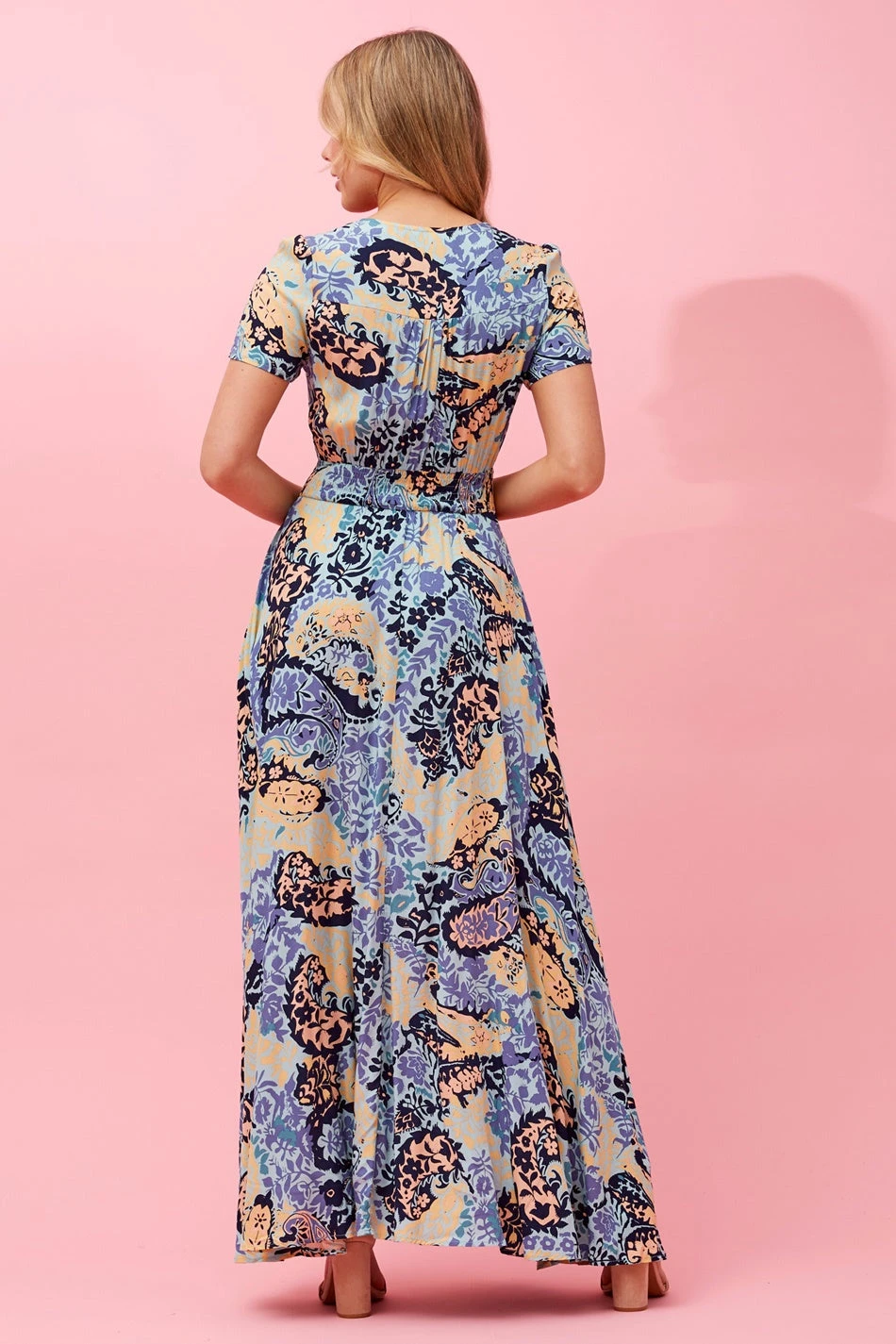Add this easy to wear maxi dress to your wardrobe for effortless styling. Fabricated in a simple comfortable fabric and designed with a V-neckline and shirred waistband to define your shape with button fastening in the centre front. Wear with simple heels for an effortless chic style.
