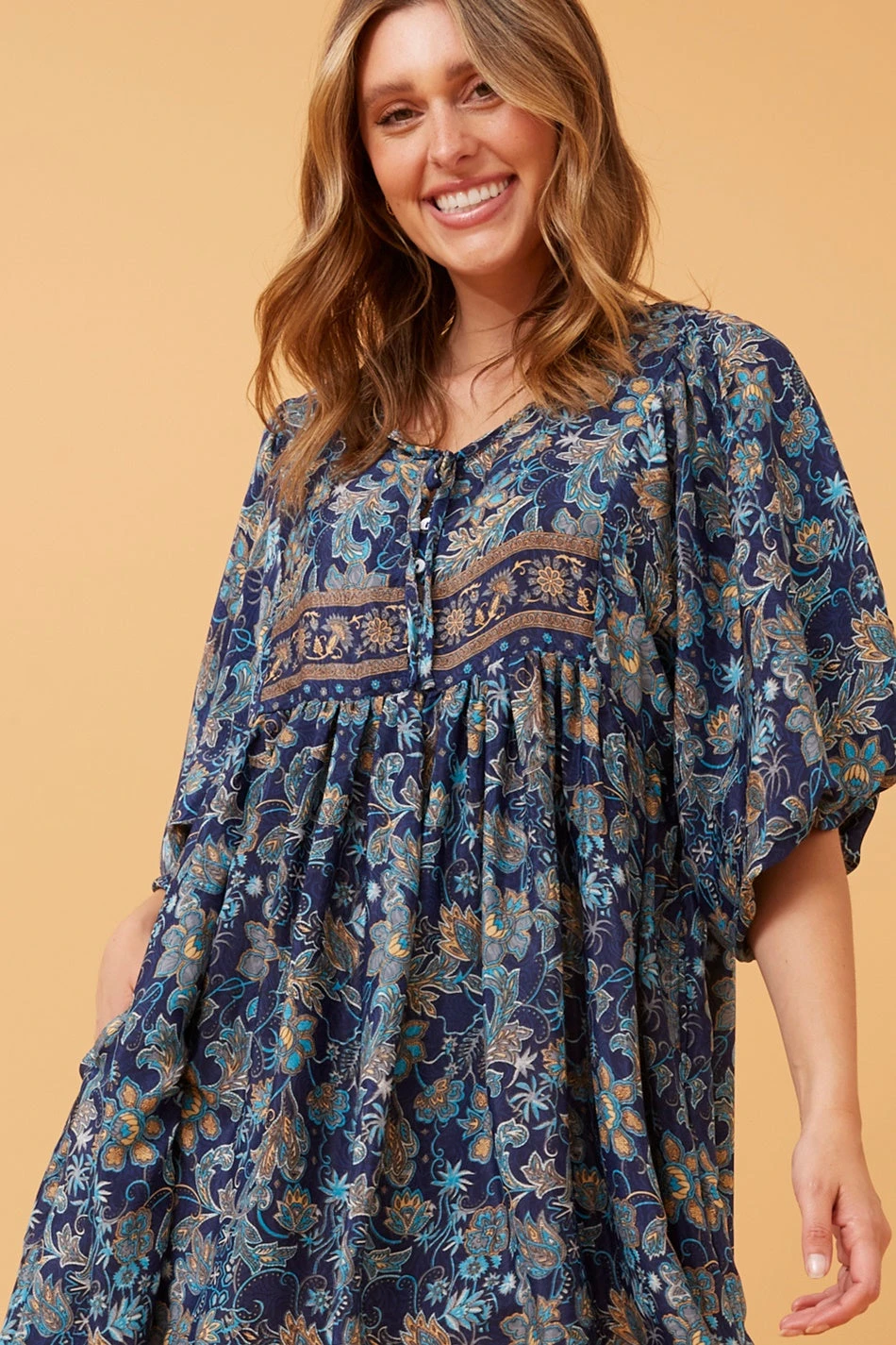 This floral boho dress will ease your wardrobe into spring with it’s gorgeous print and flattering shape. The dress features a contrasting border print and neck-tie details. Perfect for your next holiday!