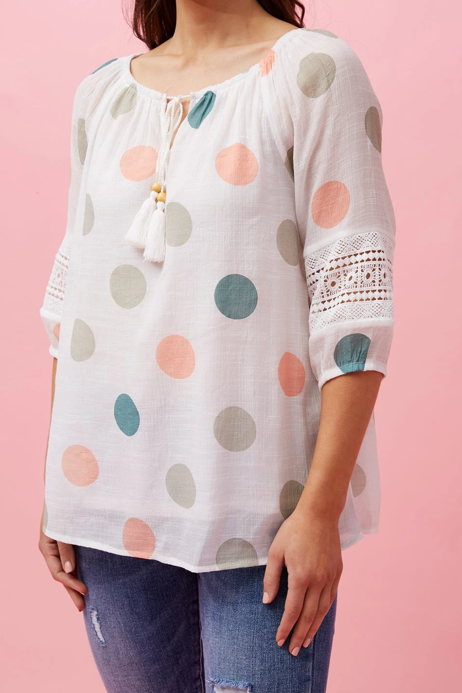 Stay comfortable and stylish this season in this lace detail peasant top. Easy to style with jeans or shorts for a cool and casual look!
