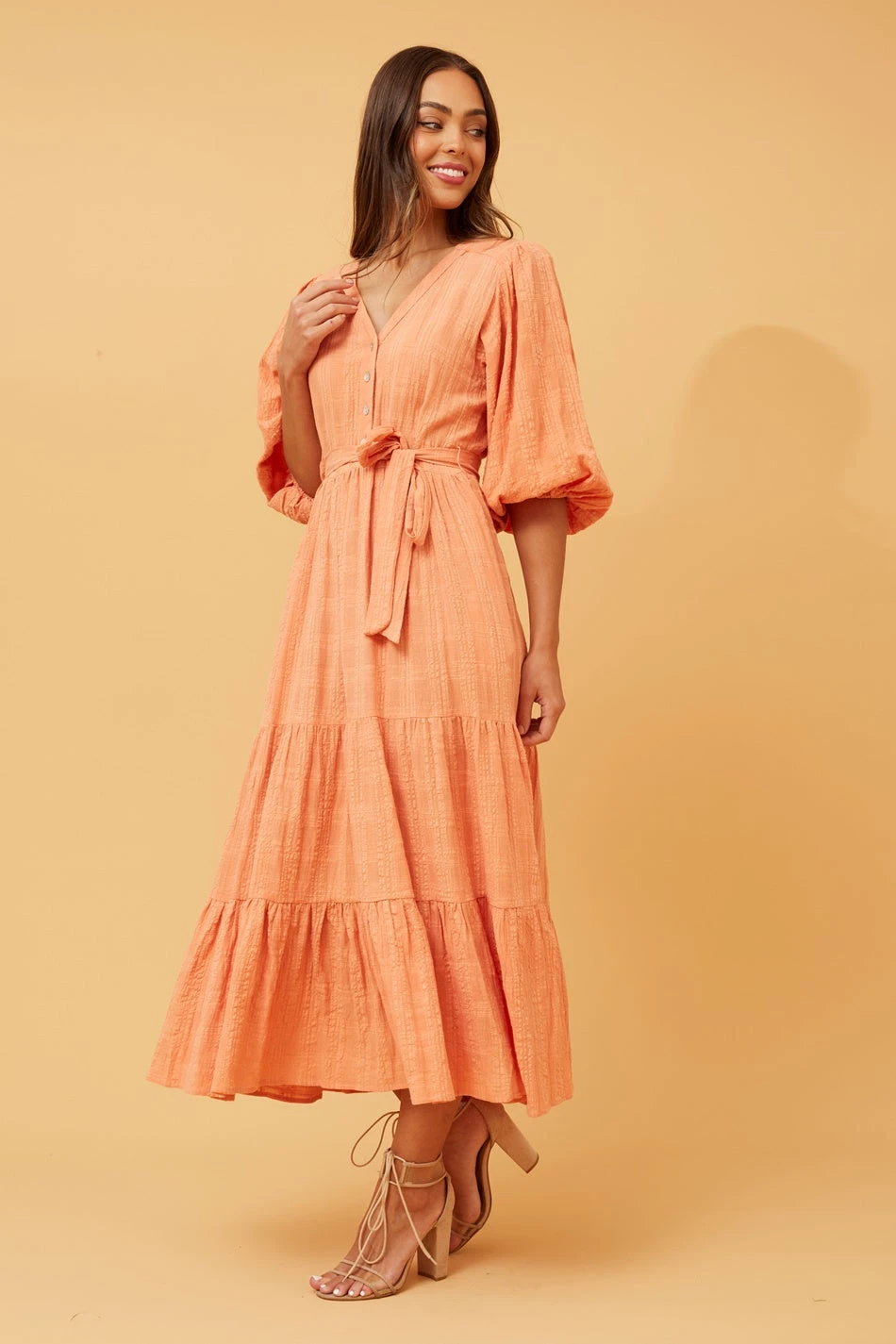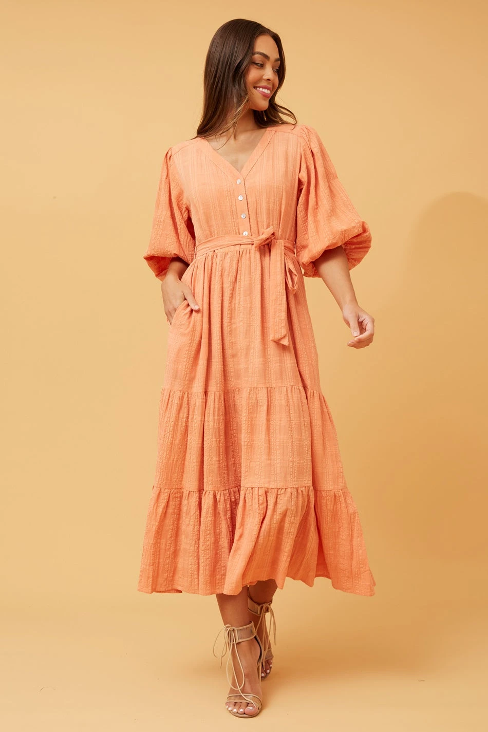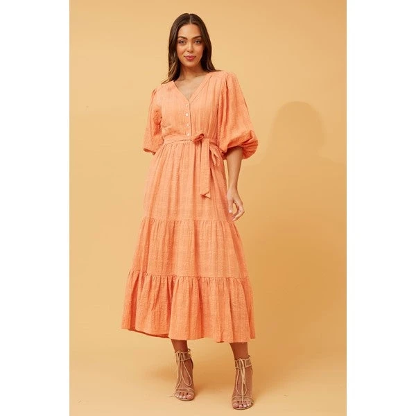 The Rianne Tiered midi dress, with its chic simplicity and versatile silhouette, seamlessly transitions from day to night. The tiered design adds a playful touch to the midi length, making it a wardrobe essential for any occasion. Solid and adaptable, the Rianne dress invites you to explore endless styling possibilities.