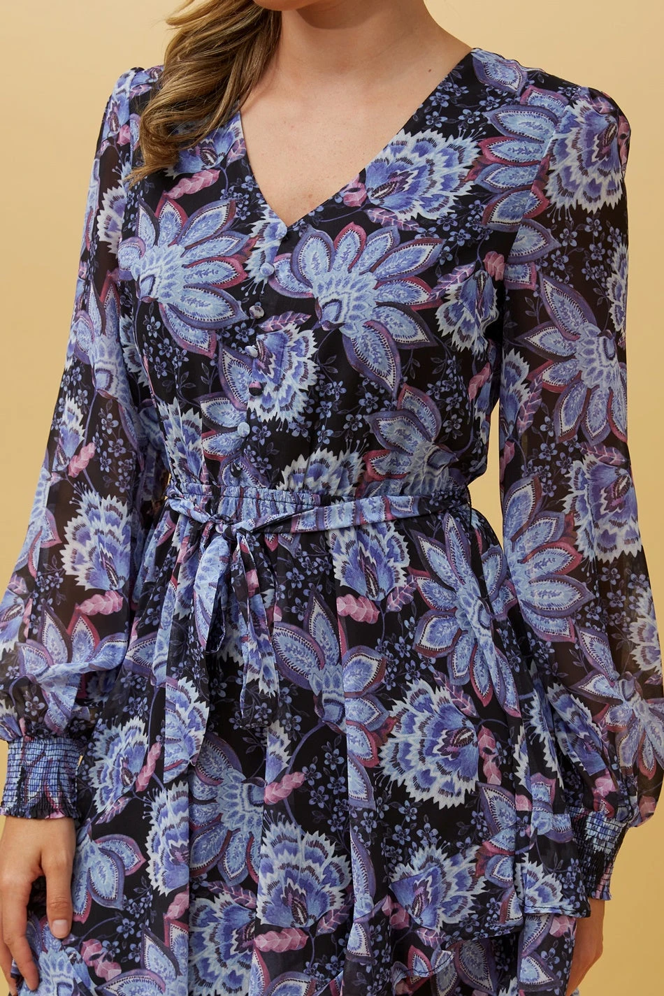 Embrace a sweet feminine look with this long sleeve floral mini dress! With a stunning floral print and ruffle tiered overlay, this mini dress can go from casual to statement based on your mood. Perfect for brunch with the ladies, or dinner with your colleagues, this dress fits all occasions. Match it with your favourite heels and chain strap bag for a sweet feminine look!