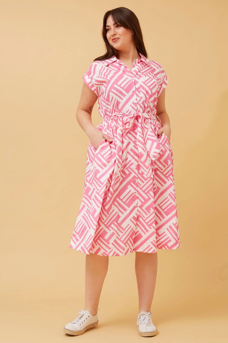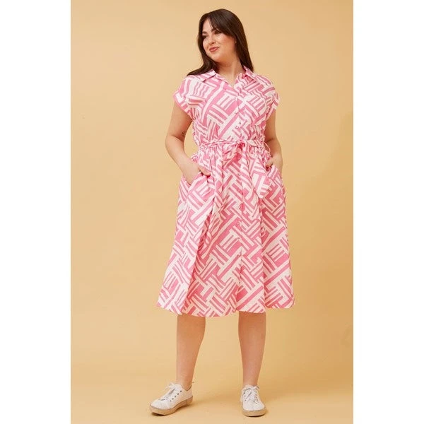 Elevate your summer wardrobe with our abstract print midi dress – featuring a flattering belted waist, and a chic midi length, this dress is perfect for everything from brunch with friends to a day out exploring the city!