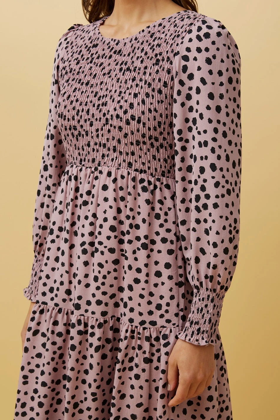 - Long puff sleeves with shirred elastic frill cuffs