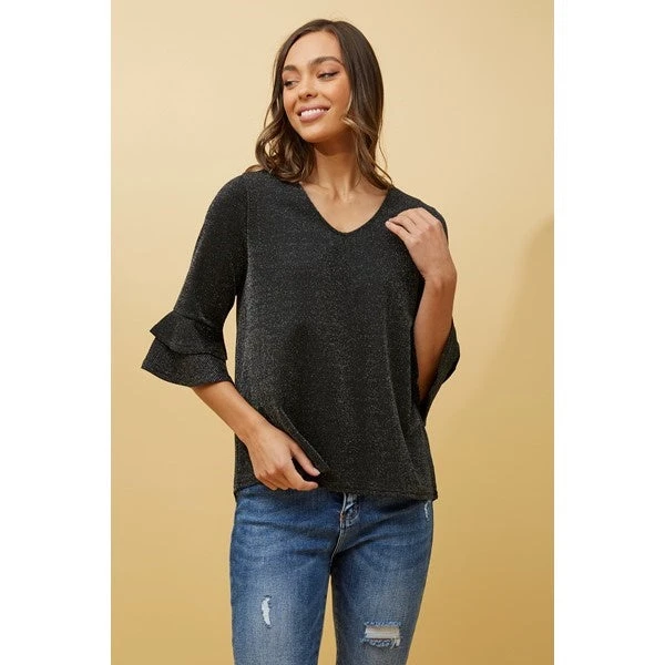 A stylish piece for 9-5 that can be dressed up or down for the weekend! Featuring a feminine double-frill sleeve and all over glitter fabric, wear with skinnies and heels to go from desk to dinner.
