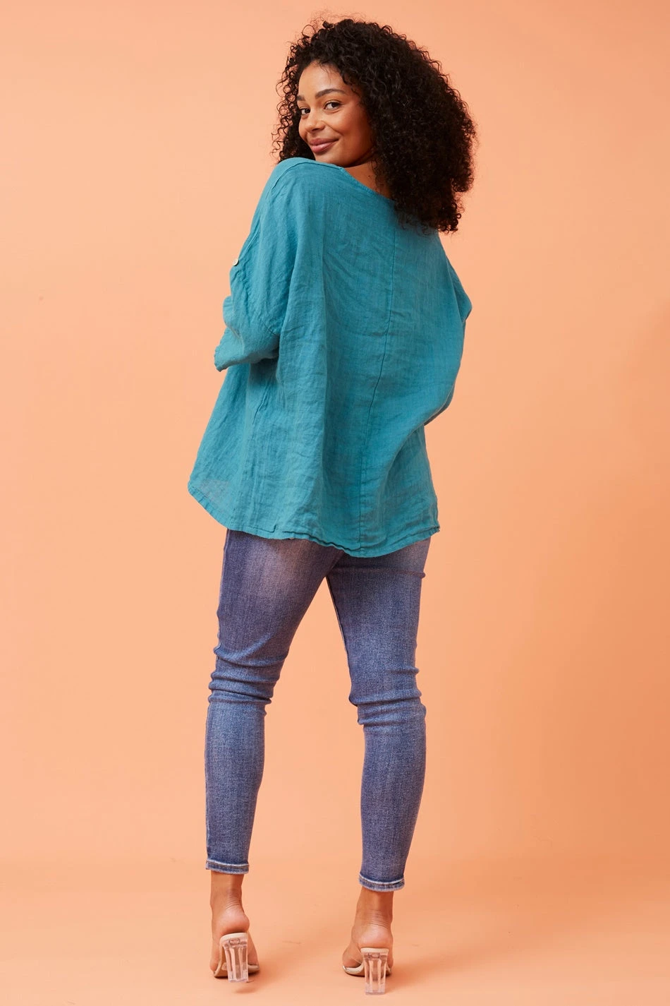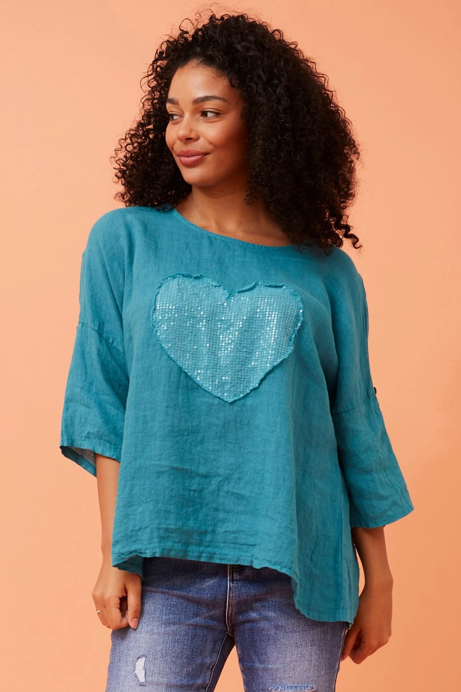 Stay comfortable and stylish this season in our Zonya sequin heart patch linen top. Easy to style with any pants for a cool and casual look!