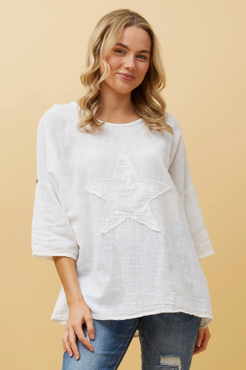 Stay comfortable and stylish this season in our Zonya sequin star patch top. Easy to style with any pants for a cool and casual look!